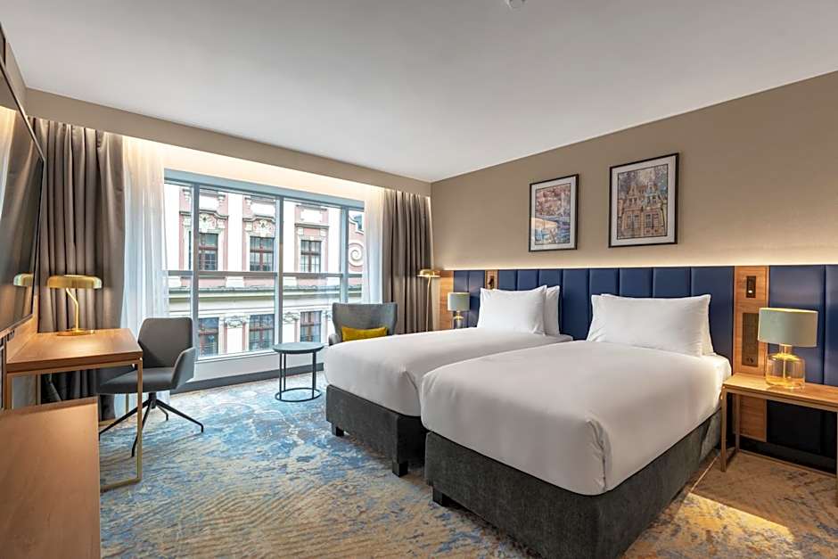 This twin room has a tea/coffee maker, seating area and bathrobe.
